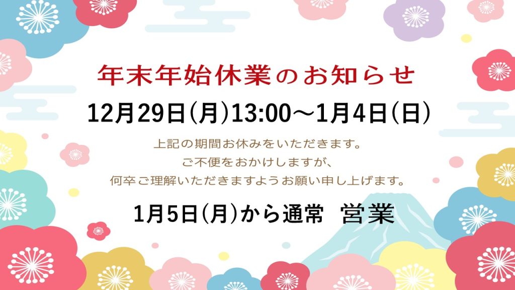 翌1月5日(月)より通常営業致します。 皆様のご来店、お問合せをお待ちしております。
